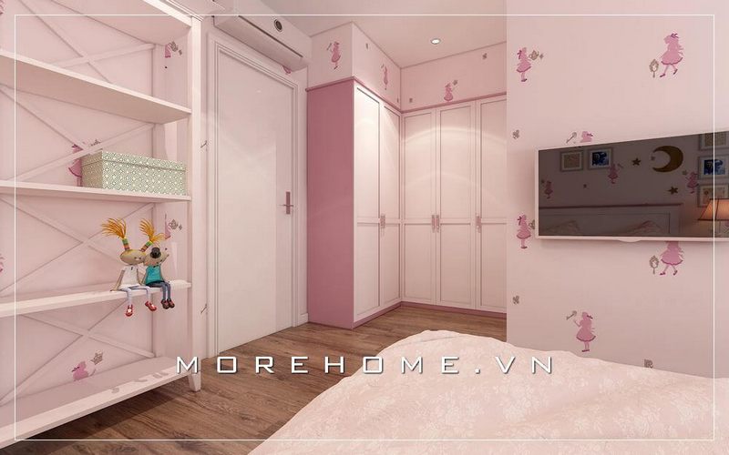 Thiết kế kệ tủ áo bé gái phong cách hiện đại, trẻ trung kết hợp kệ tủ trang trí đa năng tiện dụng