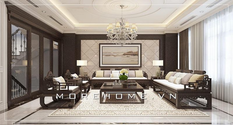 Không gian phòng khách được trang trí nội thất theo phong cách Indochine, kết hợp tinh tế giữa hai nền văn hóa Đông-Tây, tạo nên một không gian thẩm mỹ cao có nét riêng.
