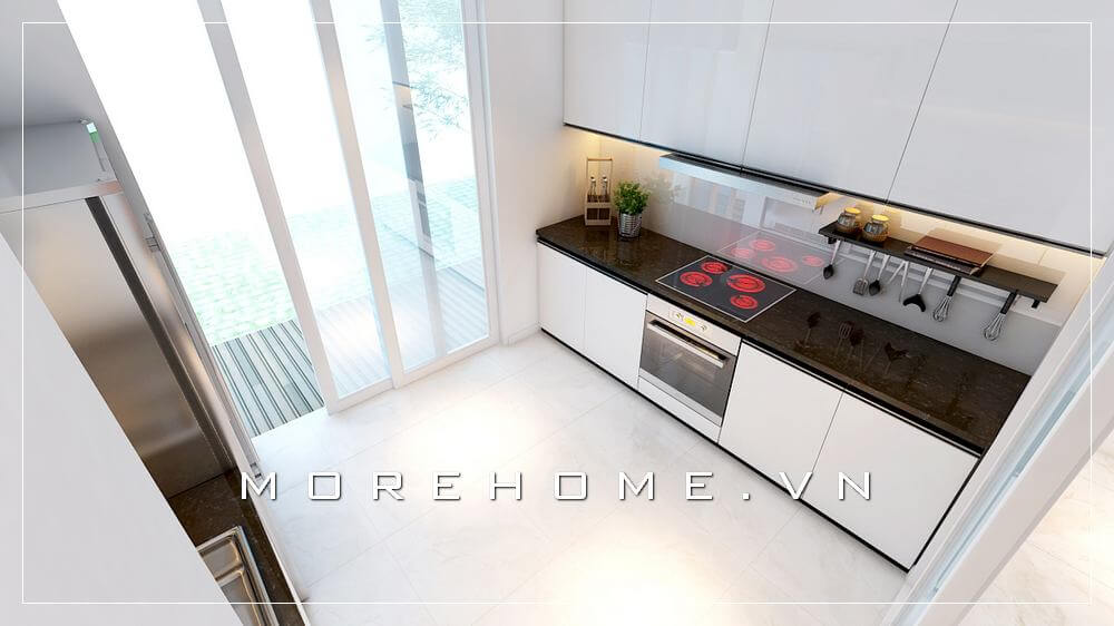 Mẫu tủ bếp gỗ công nghiệp acrylic tone màu trắng hiện đại, mặt bếp ốp đá màu đen giúp không gian bếp sạch sẽ và thoáng mát hơn
